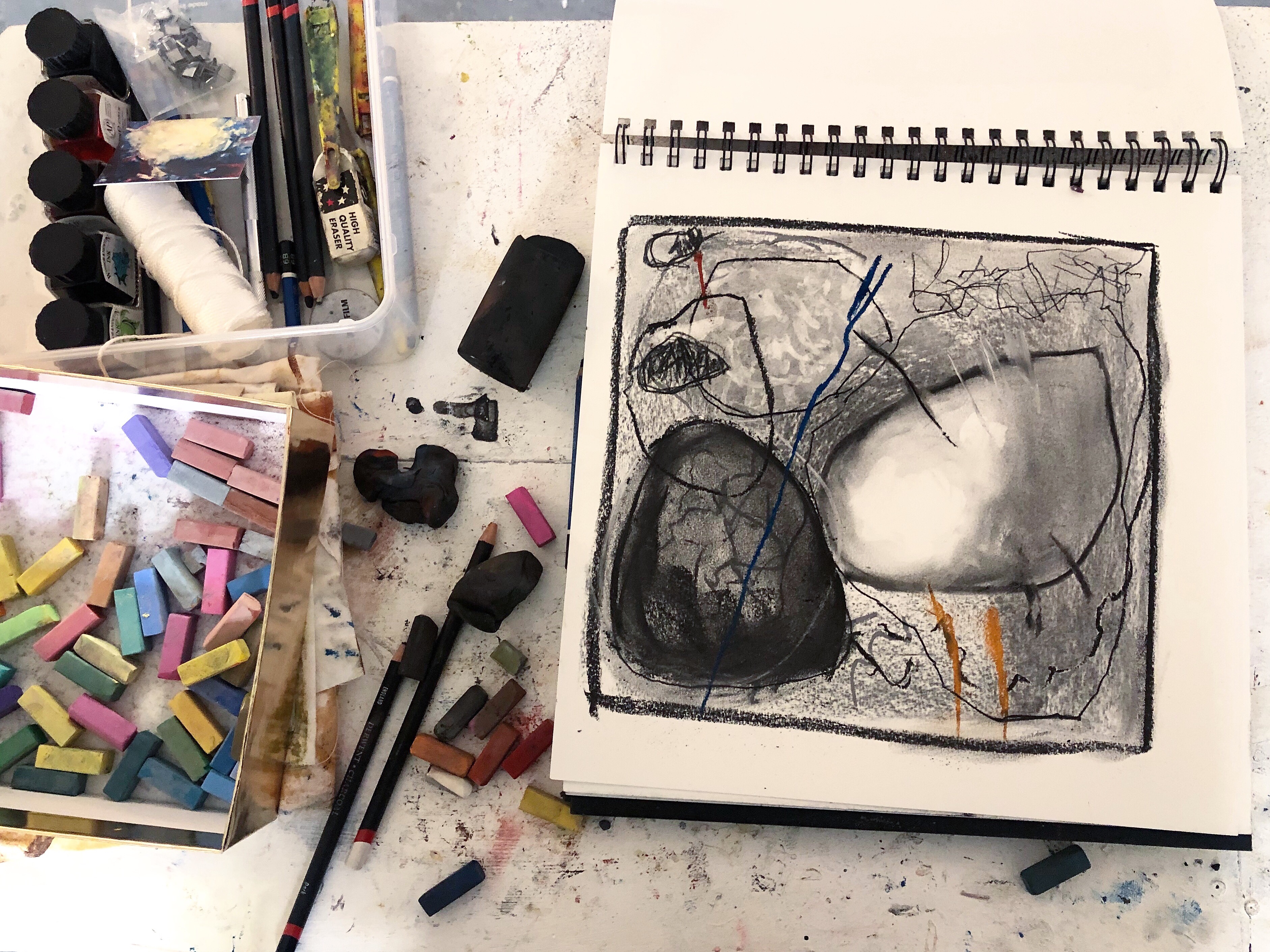 Trying to fix a painting.. inspired by thoughts and visual awareness from my hike today..well yesterday now.. terrains, tree felling, January sunset, tree stumps, wild winds over Lough Tay and spying on sparrow hawk trying to fly against the winds.. .