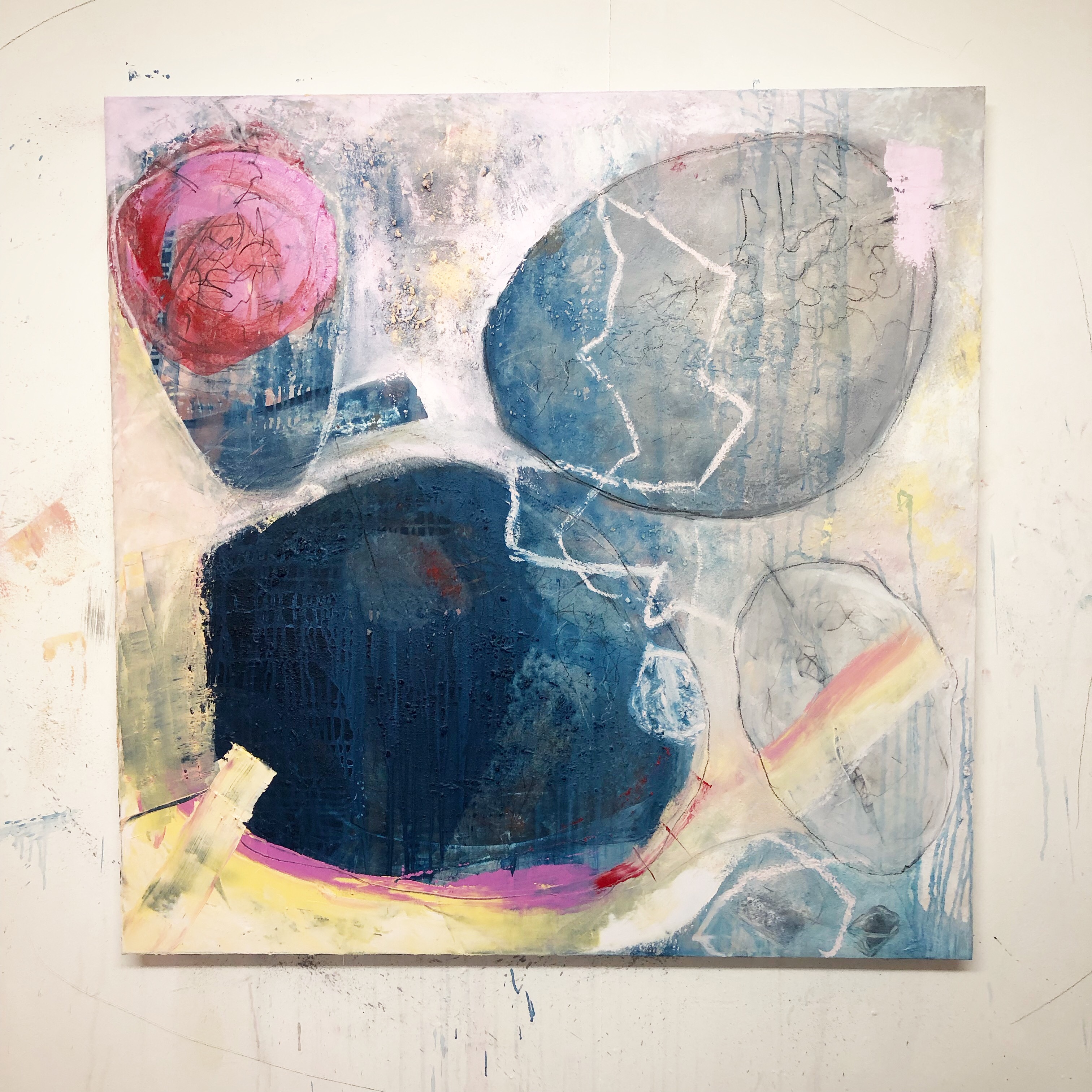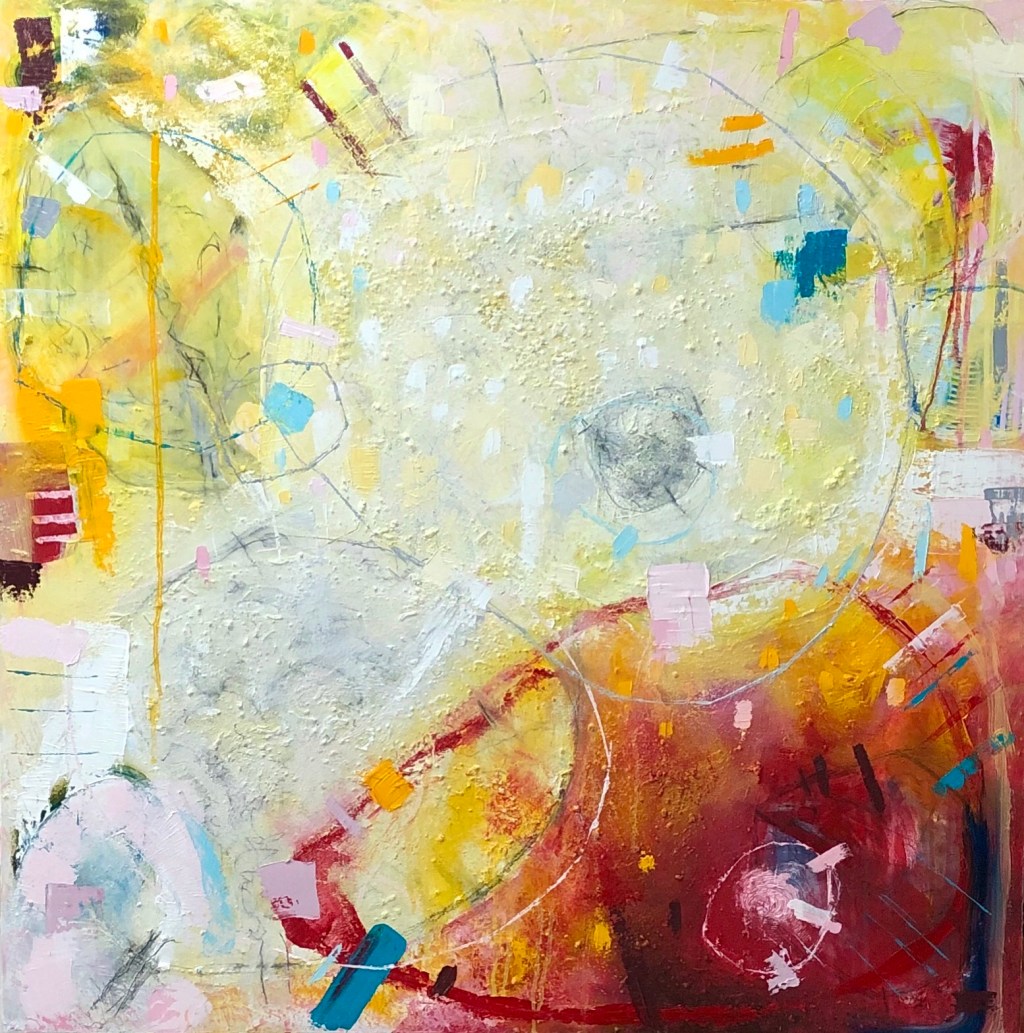 In the above image is where it had come to in the beginning stages. In the first layer I used sand with PVA, which I haven’t used sense my previous trees series. I used the sand to start the beginnings of the composition and then when the PVA mixed with the sand dried I painted the next layer which was oils and colour with oil sticks to mark make. I painted loosely where the painting seemed to want to go toward. I left it for a few weeks and felt it needed to warmer and brighter. So far this is its progress.. it may be concluded but I’ll give it time to rest.