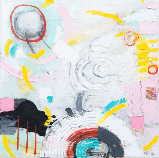 I wanted to bring a certain delicacy and sense of soft movement to the work. The paint is layered above loose under drawings and marks in pencil and charcoal. The pastel colours of pink and yellow among the bright whites lean toward the delicacy and innocence of young children as they blossom and grow. The reds are in response to memory of love and what never came to be with Yeat’s unrequited love for Maud Gonne. The blacks and monotones are leaning toward ‘death nearing’ and are also expressions of light and dark abstracted.