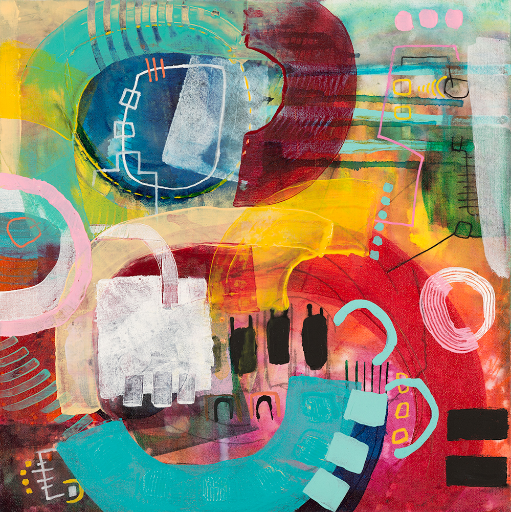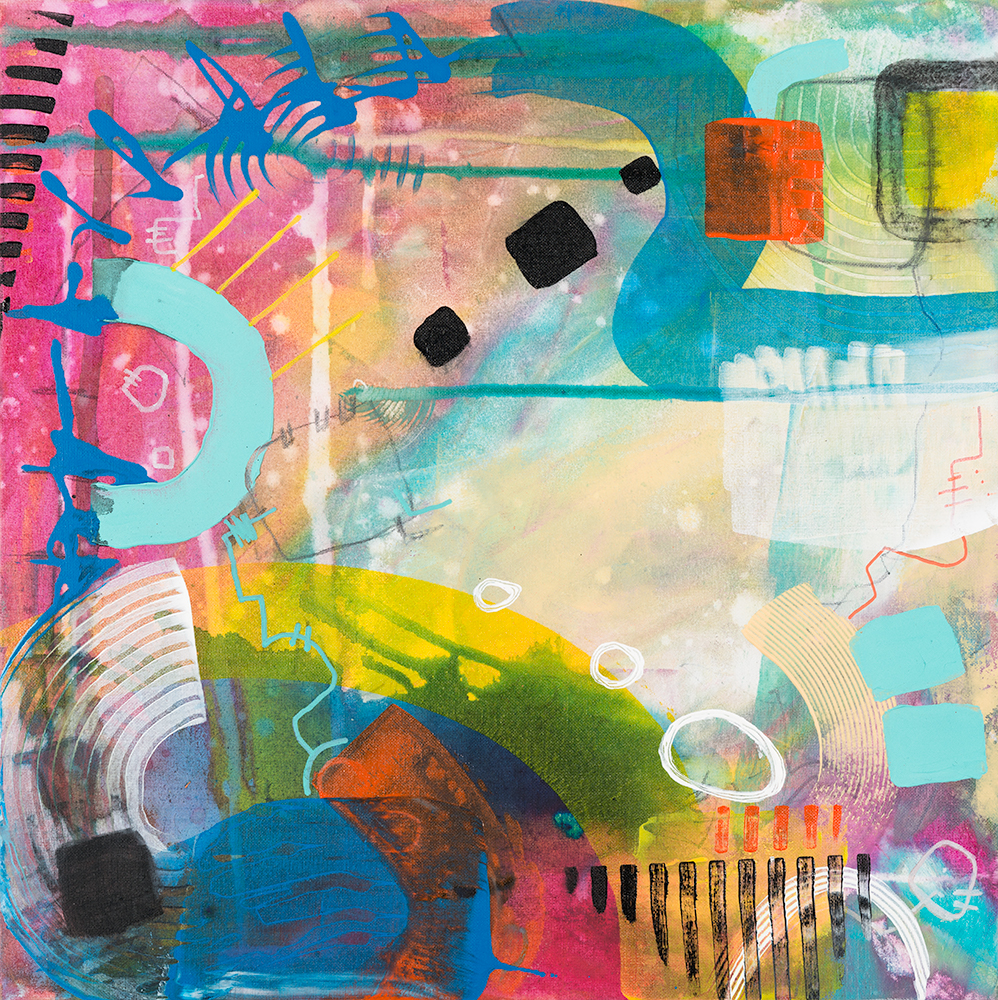 I listened to music while producing this work as I always do when painting and the music I chose was uplifted energetic sounds to suit the vision I had in my mind at the time. In the work I wanted to create a sense of dance, movement, flight and float in a bright atmospheric surrounding where colour plays a significant part.
